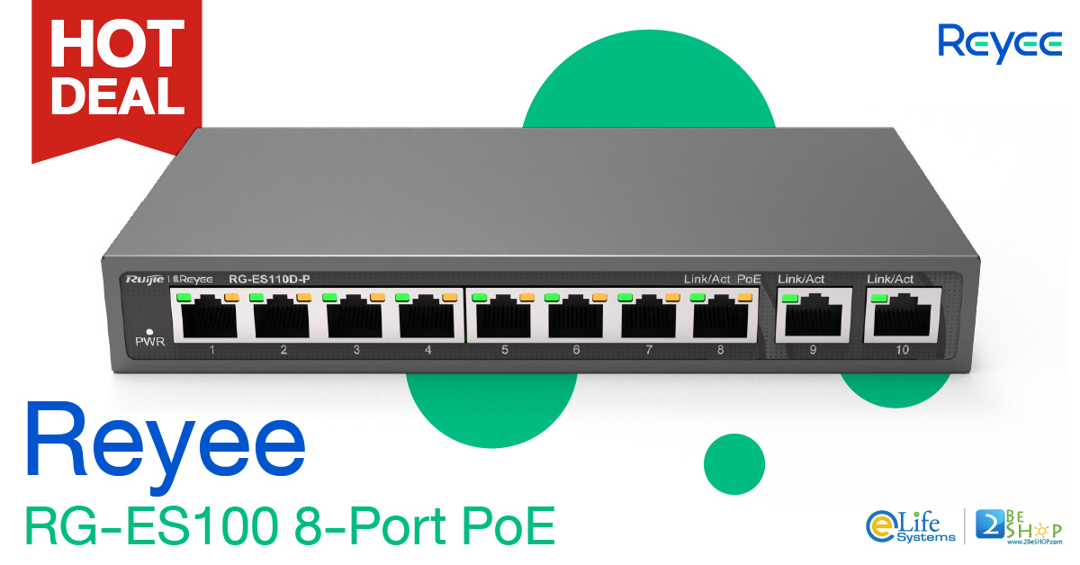 Reyee 8-Port 100Mbps + 2 Uplink Port 1000Mbps unmanaged Switch, 8 of the ports support PoE/PoE+ power supplyPower Consumption : <129W